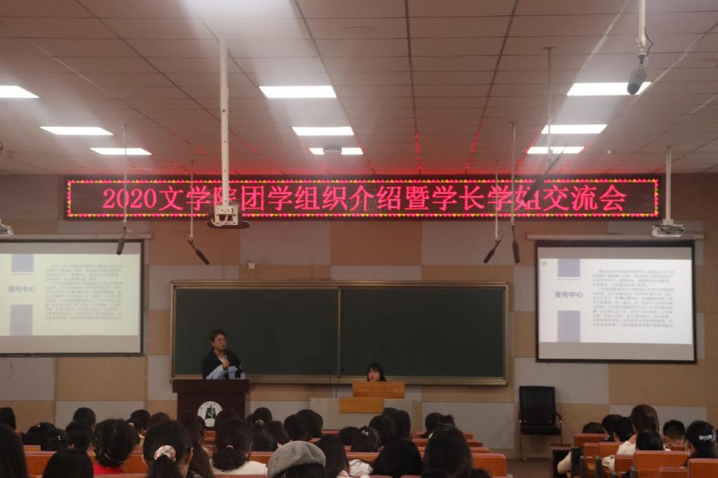 5日上午,笃行苑在B300举行的文学院团学组织介绍暨学长学姐交流会。多名2018级团委骨干向学生们详细介绍了团学组织的相关职能,为后续招新工作的顺利展开打下基础。荣获2020年国家奖学金的2018级本科生吴莎为文学院2020级新生给出了五条建议:定目标、讲方法、去浮躁、求严谨、会反思。现任文学院学生会执行主席的2018级本科生王丽娜结合亲身经历分享了自己在学习、工作方面的心得。她表示:“同学们要找到自己真正的兴趣点,通过社团等学生工作来提升相关技能,获得一块敲门砖。”她倡导同学们要学会主动与前辈交流,充分利用自己所掌握的资源。