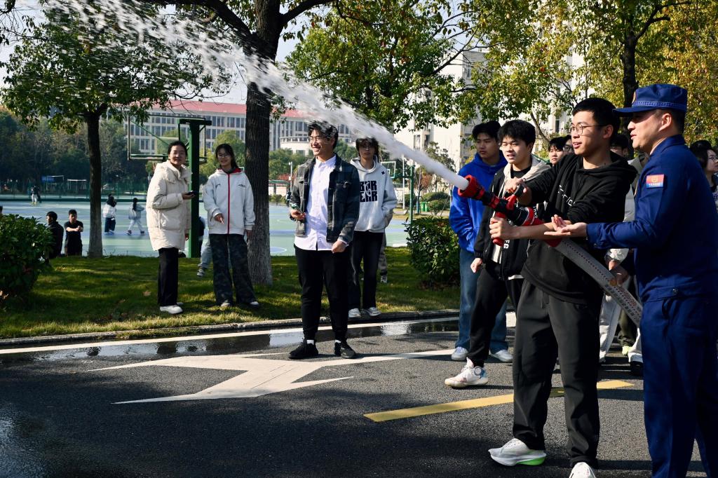 理论知识讲解后,活动进入了备受期待的消防器材实操环节。教官们现场演示了干粉灭火器“提、拔、握、压”的正确使用步骤,以及消防水带的快速连接与使用方法。在教官的专业指导下,师生代表们踊跃上场,亲身体验了模拟灭火过程,掌握了器材的操作要领,实现了从“理论知识”到“实战技能”的有效转化。同时消防队员们还向同学们展示了新型消防装备的使用和操作技能。