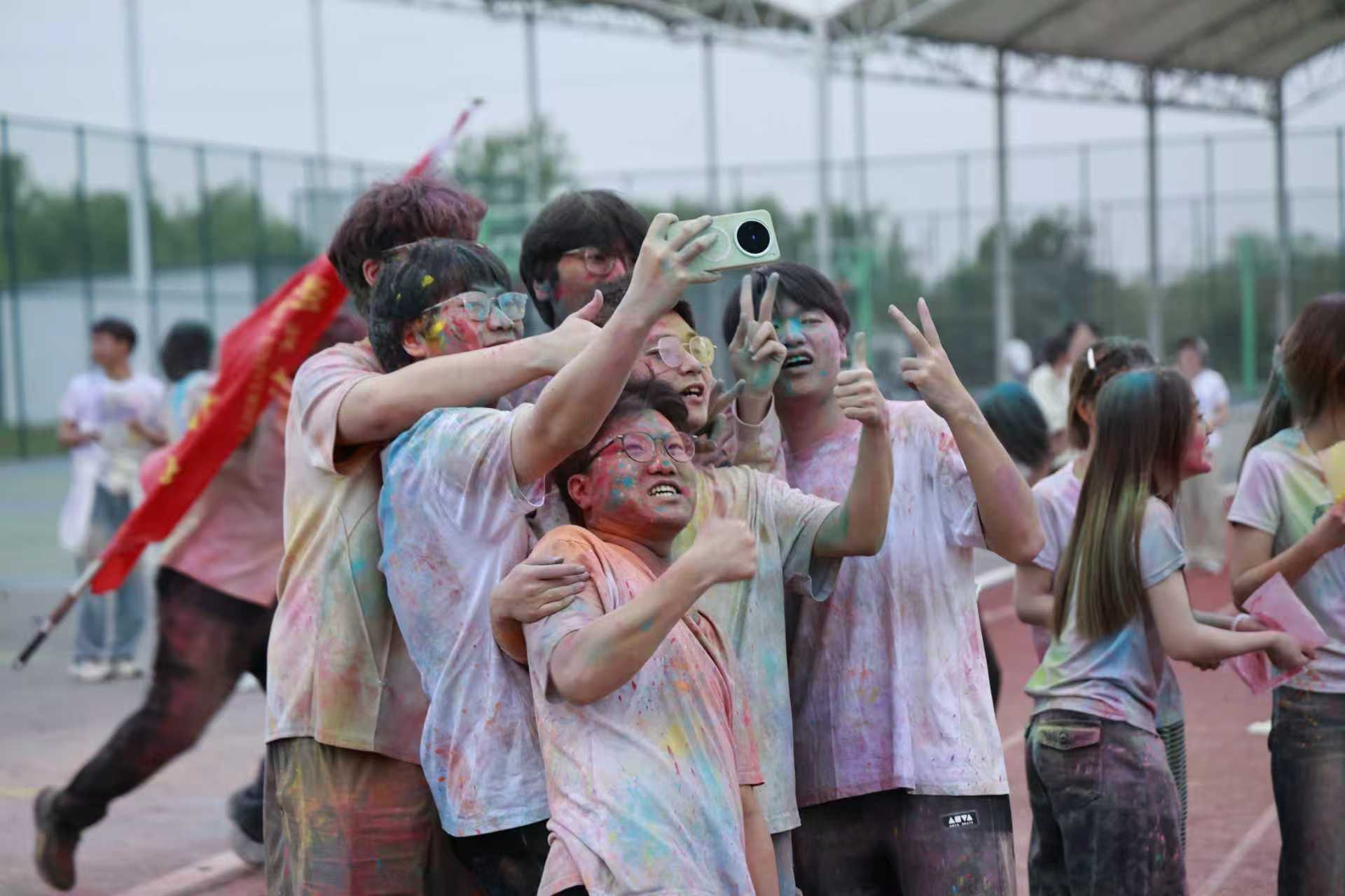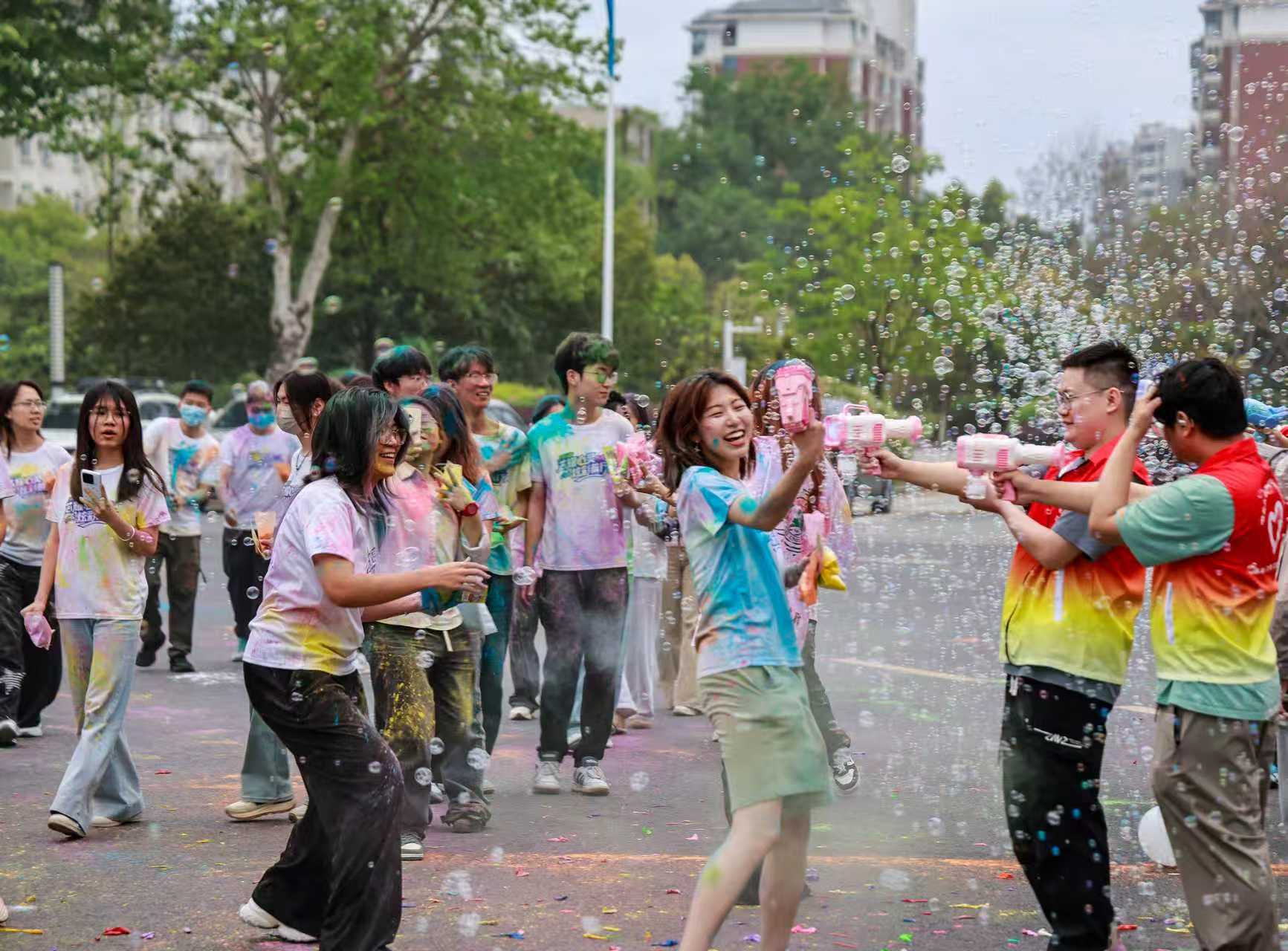 活动打破传统竞速模式,设置了多个创意打卡环节,让奔跑不再单调。在“色彩寻人”打卡点,同学们主动组队,寻找身上带有两种颜色的伙伴,携手定格创意合影;在“穿越泡泡隧道”环节,大家穿梭于梦幻泡沫之间,欢笑声此起彼伏。